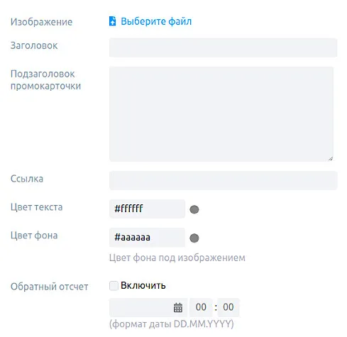 - Включите «Обратный отсчёт», чтобы показывать время до окончания промоакции. Время окончания можно установить отдельно от времени завершения промоакции.