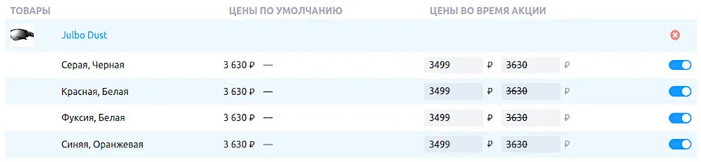 Для каждого товара можно отключить отдельные артикулы. Если не отключать ни одного артикула, в промоакции участвуют все артикулы товара.