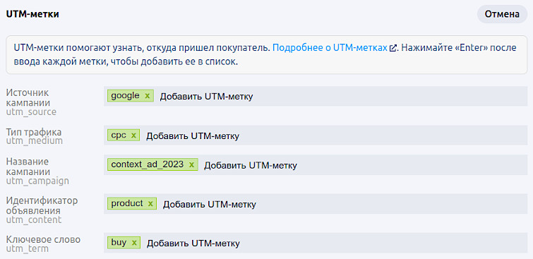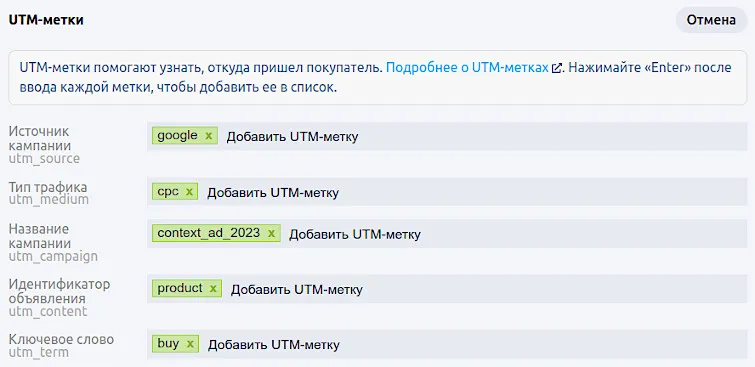 Заголовок раздела «Инструмент «UTM-метки»»UTM-метки — это специальные параметры, которые добавляются к ссылке на магазин. Они помогают понять, откуда пришёл покупатель и какая реклама сработала.