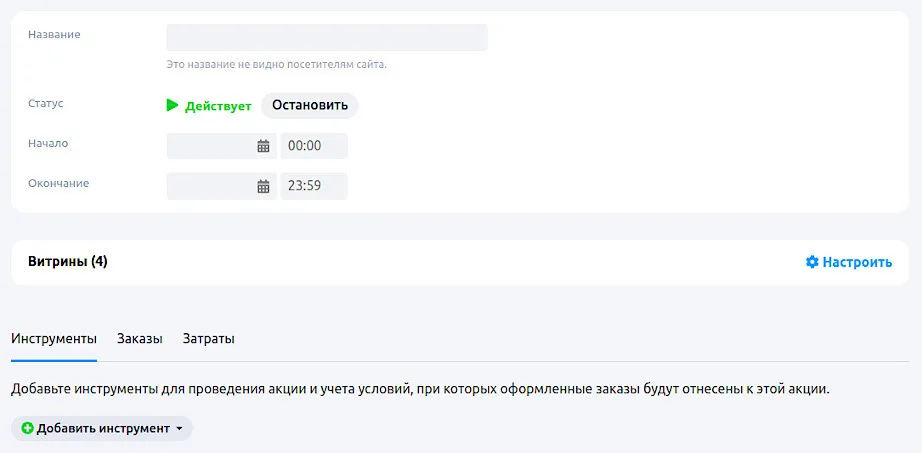 - Дата и время начала и окончания — укажите, чтобы запланировать проведение акции. Если настроить дату и время, акция автоматически начнётся и завершится в указанный момент.
