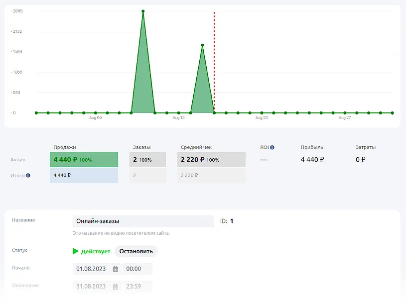Эти данные помогут отслеживать расходы и анализировать окупаемость каждой промоакции. Информация доступна в разделе Отчёты.