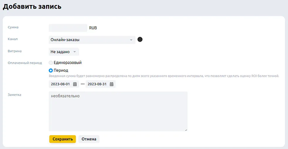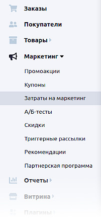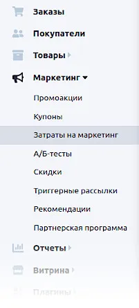 Добавить записи о затратах также можно через ссылку «Затраты на маркетинг» в боковой панели. В этом случае канал продаж нужно выбрать вручную.