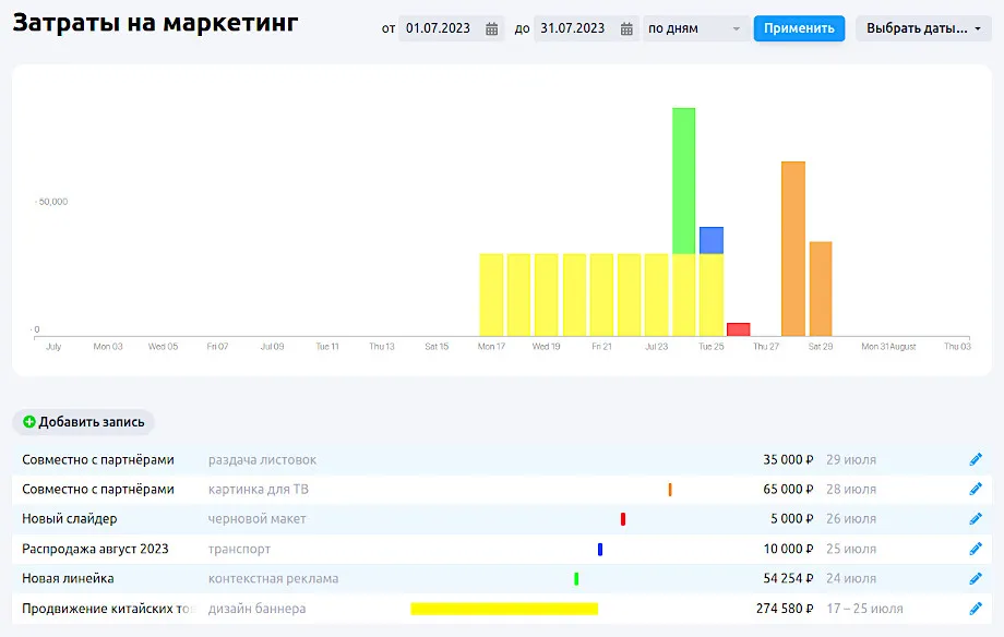 Все записи о затратах для разных акций отображаются на общей странице «Затраты на маркетинг».