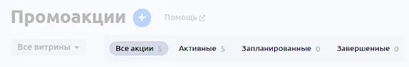 Заголовок раздела «Как найти нужную промоакцию с помощью фильтра»Промоакции могут иметь разные статусы: активные, запланированные на будущее или уже завершённые. Если акций много, используйте фильтр, чтобы быстро найти нужную: