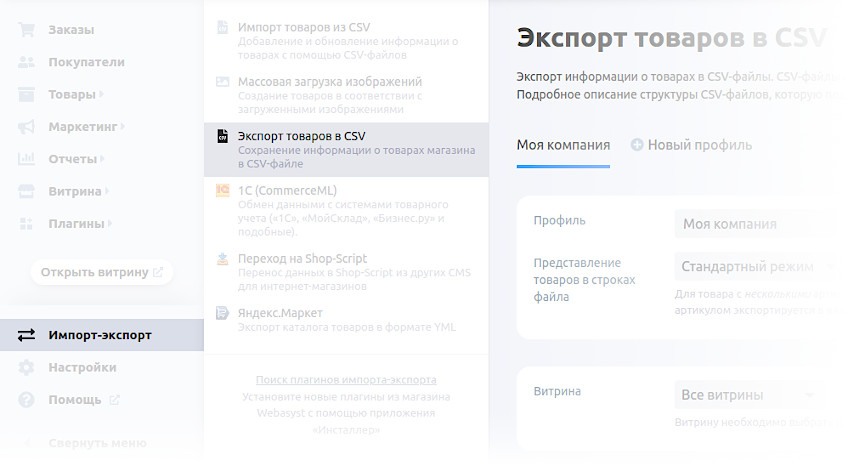 Экспорт товаров в CSV-файл позволяет перенести каталог в другой магазин или обновить информацию о товарах через табличный редактор.