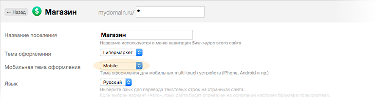 В верхней части страницы перечислены настройки приложения «Сайт». Его тема является общей для всего семейства «Гипермаркет» — она задаёт общий стиль для всех приложений.
