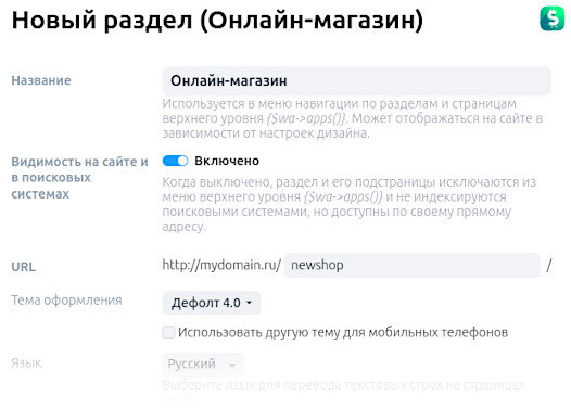 - Задайте адрес витрины, выберите тему оформления и укажите параметры: способы доставки, оплаты, типы товаров и прочее.