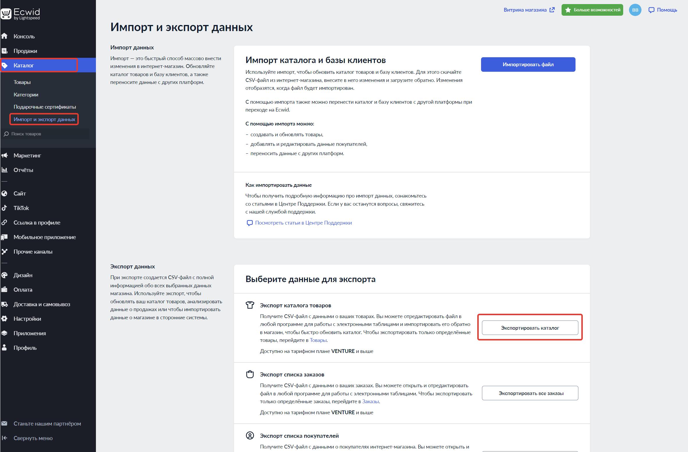 Заголовок раздела «Экспорт товаров из Ecwid»- Откройте панель управления Ecwid и перейдите в раздел «Каталог → Импорт и экспорт данных».