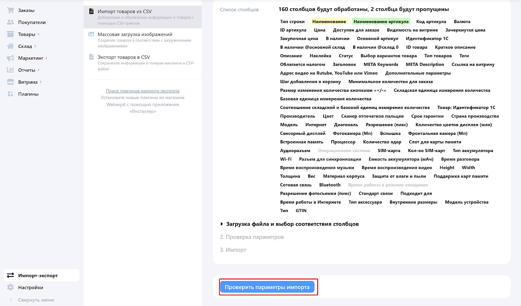 Предварительный анализ покажет количество товаров, категорий и артикулов для импорта. Если числа не совпадают с ожидаемыми — проверьте настройки и запустите проверку снова.