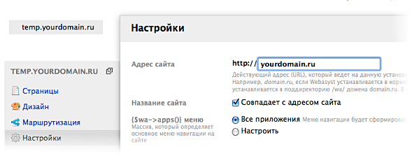 - Установите фреймворк Вебасист по инструкции на поддомене (например,
