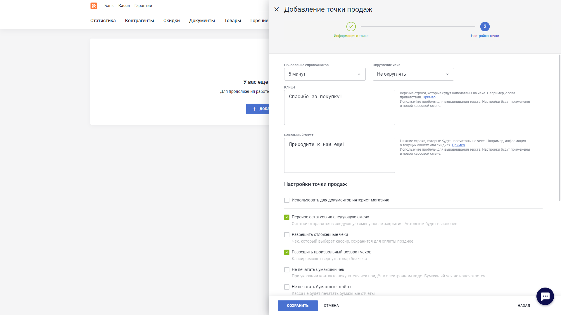 Выберите настройки кассы. Подробнее об этом — в инструкции «МодульКассы».