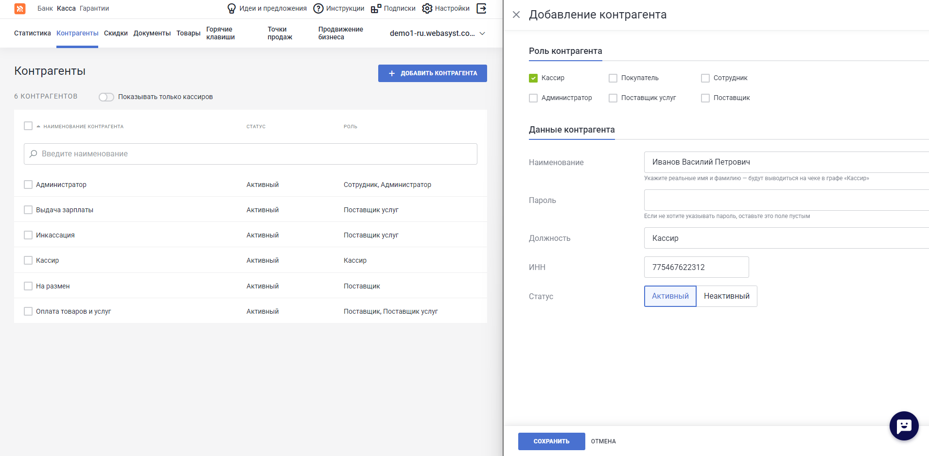- Выберите роль «Кассир», введите требуемые данные и сохраните.