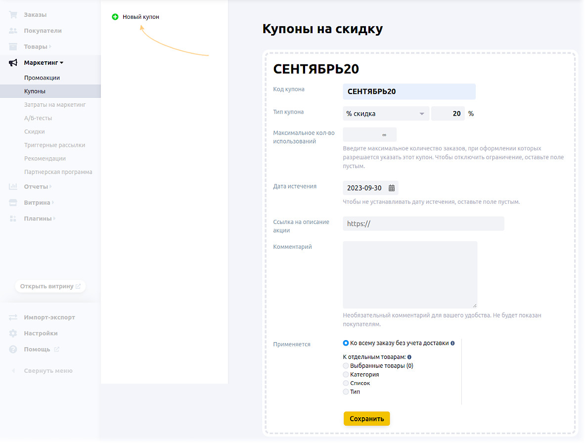 Заголовок раздела «Где создавать купоны»Добавляйте и редактируйте купоны в разделе Маркетинг → Купоны.