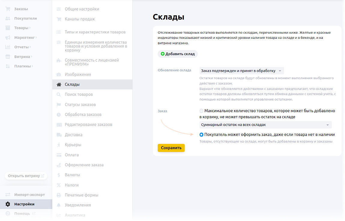 - Включите настройку «Покупатель может оформить заказ, даже если товара нет в наличии».