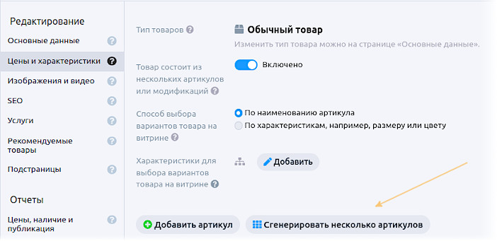 На вкладке «Цены и характеристики» нажмите «Сгенерировать несколько артикулов».
