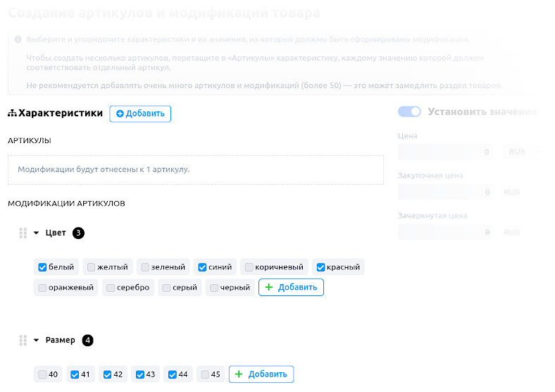 Создайте характеристики с форматом «Выбор нескольких значений из списка». В примере с кроссовками понадобятся две такие характеристики: «Размер» и «Цвет». При создании укажите их значения: