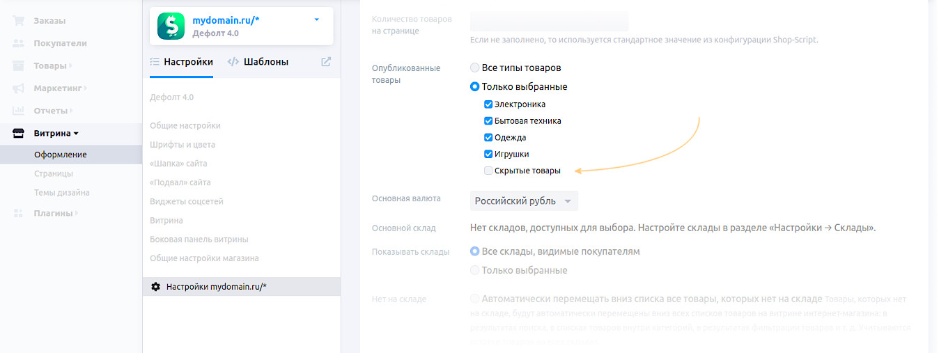 Затем в настройках витрины уберите галочку с этого типа — товары перестанут быть видны покупателям.