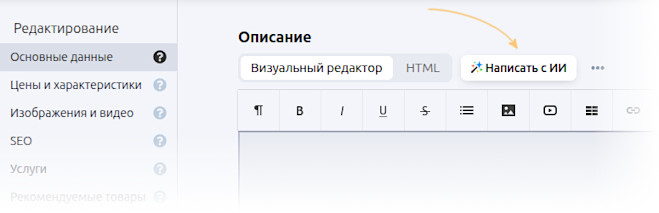 Начиная с версии Shop-Script 11.4.0 описания и другие SEO-параметры товаров можно заполнять автоматически с помощью искусственного интеллекта (ИИ). Это экономит время и помогает быстро заполнить каталог привлекательными описаниями.