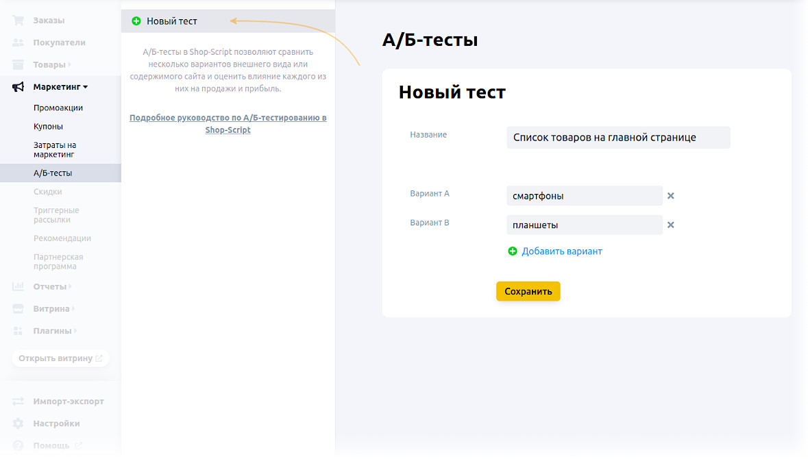 Заголовок раздела «Шаг 1. Создайте тест»Перейдите в раздел Shop-Script → Маркетинг → А/Б-тесты и нажмите Создать тест.