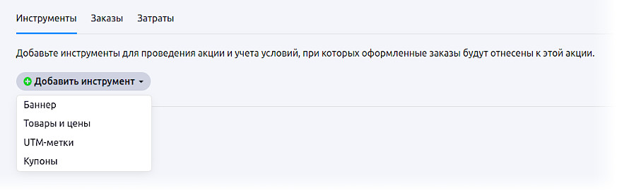 Заголовок раздела «Инструменты промоакции»Каждая промоакция использует набор инструментов. Вы можете выбрать любые инструменты и комбинировать их: