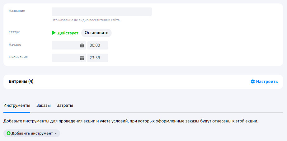 - Витрины — выберите, на каких витринах должна действовать акция.