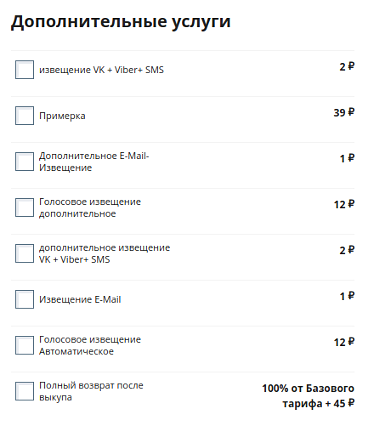 Заголовок раздела «Причина расхождения»При использовании калькулятора убедитесь, что выбраны те же дополнительные услуги, которые указаны в вашем договоре с «Яндекс Доставкой» (Boxberry).
