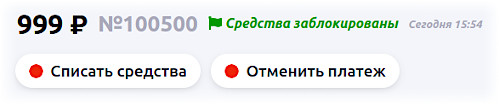 Действия «Списать средства» и «Отменить платеж» доступны, когда заказ находится в статусе «Средства заблокированы». Этот статус устанавливается автоматически, когда банк или платёжная система присылает уведомление (callback) о блокировке денежных средств покупателя.